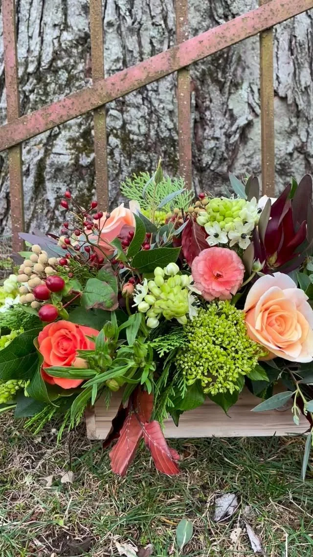 We primarily source cut flowers, greenery and plants that are locally grown. We compost 100% of our perishable waste; we forage our natural environment for branches, lichens, pods and cones; we source thrift shops, tag sales and flea markets to repurpose containers and always welcome our customers' containers for reuse in our shop.
