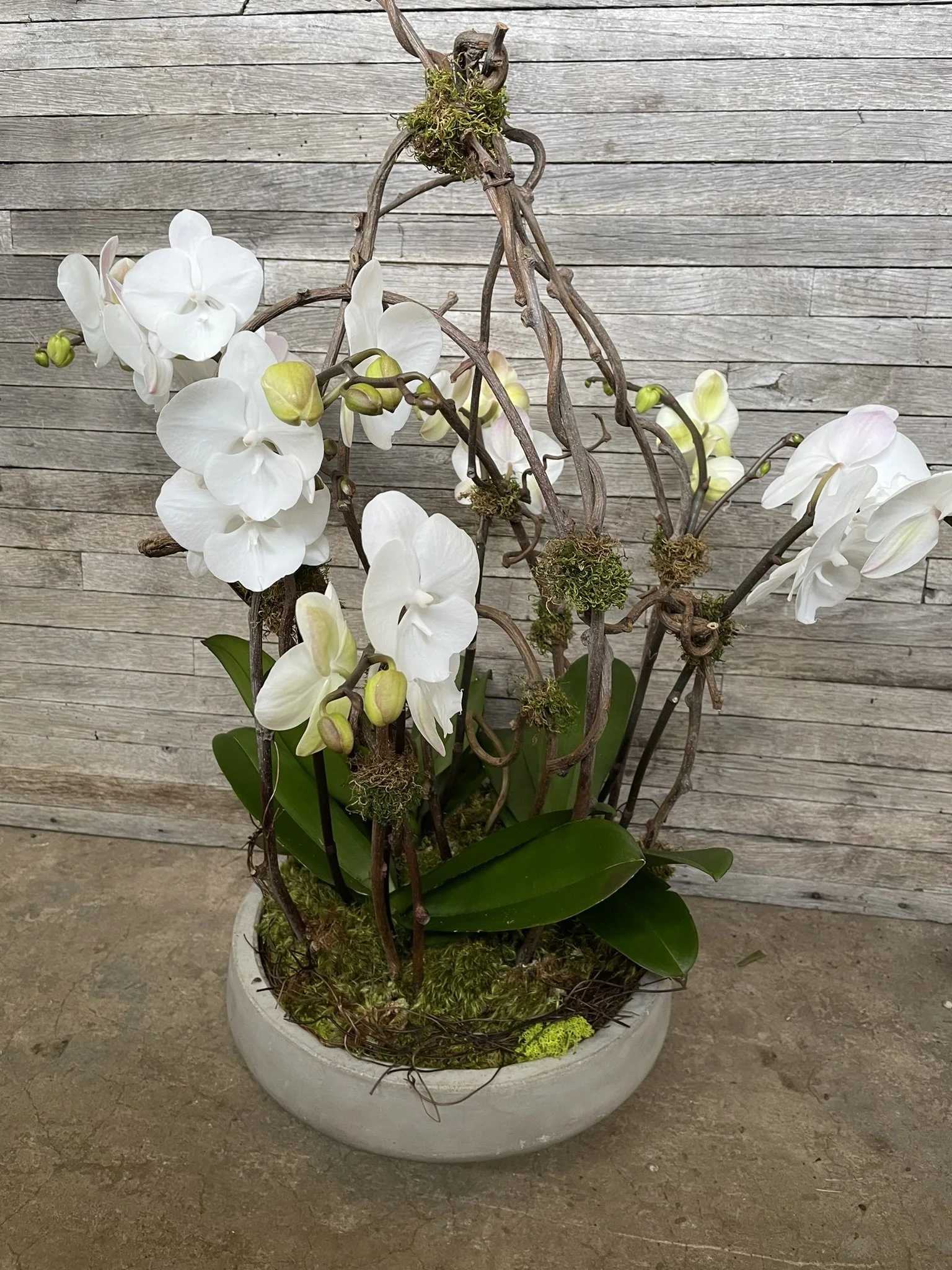 We offer planted orchid creations year-round and have various colors and sizes available. If you have a particular color request, please indicate in the notes for the designer section at checkout, and we will do our best to accommodate.